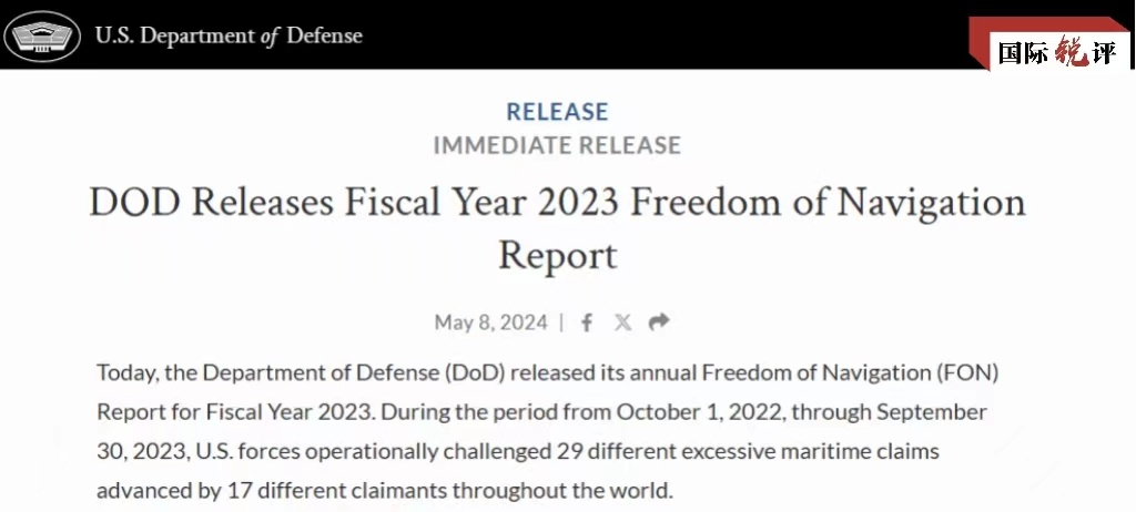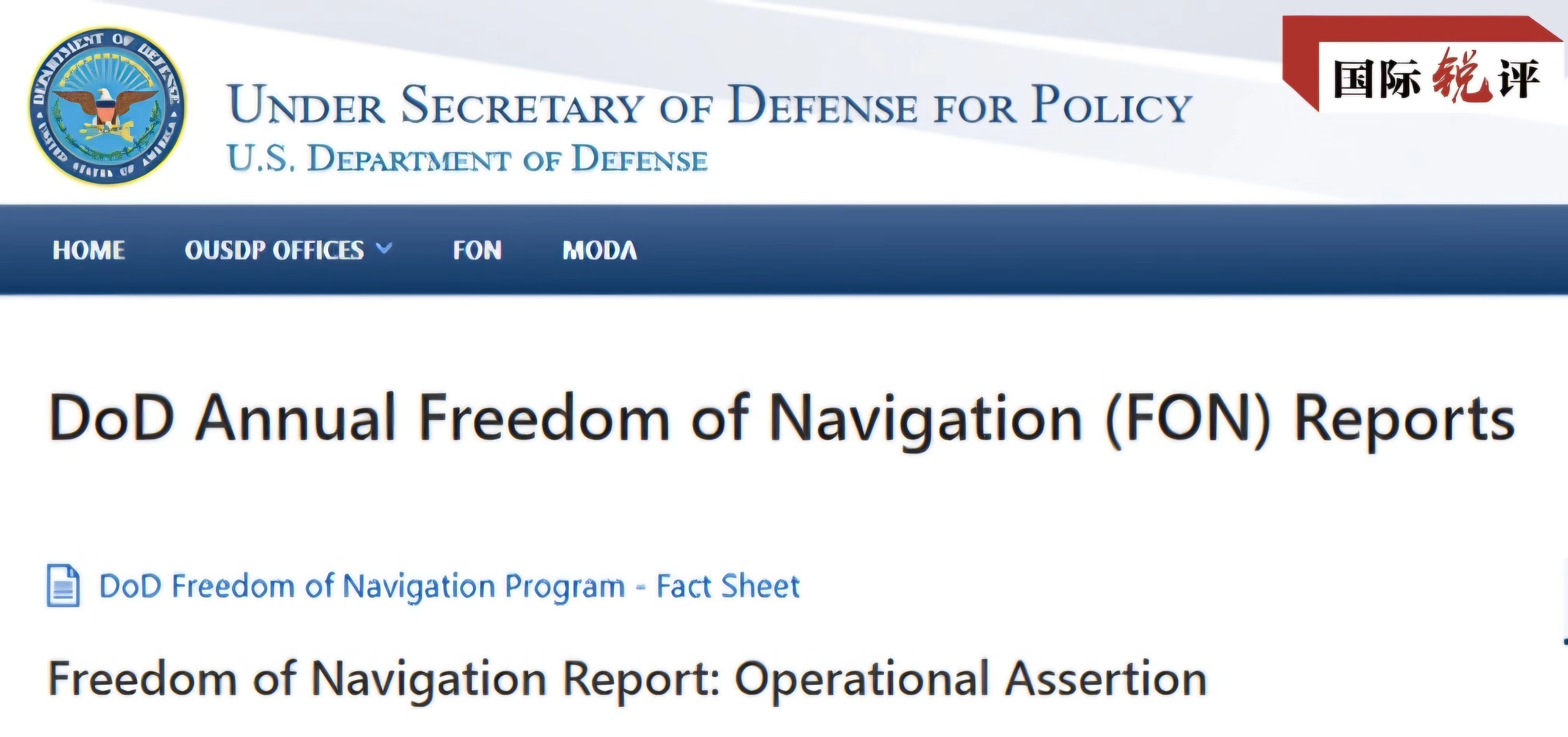 像美国国防部最近发布的“航行自由”报告,从1991年开始,基本每年都会定期发布。据统计,截至2022年,美国已累计对60多个国家实施了600多次“航行自由行动”,挑战超过700项所谓“过度海洋主张”。