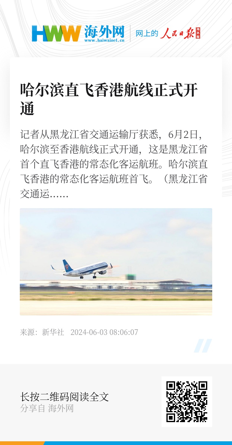 记者从黑龙江省交通运输厅获悉,6月2日,哈尔滨至香港航线正式开通,这是黑龙江省首个直飞香港的常态化客运航班。