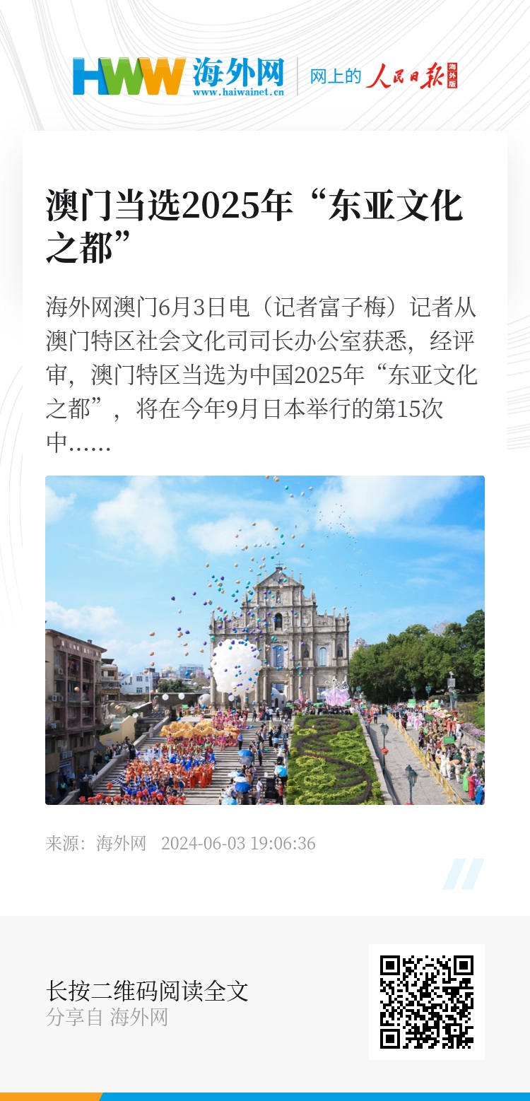 海外网澳门6月3日电(记者富子梅)记者从澳门特区社会文化司司长办公室获悉,经评审,澳门特区当选为中国2025年“东亚文化之都”,将在今年9月日本举行的第15次中日韩文化部长会议上,获颁2025年“东亚文化之都”城市牌匾。