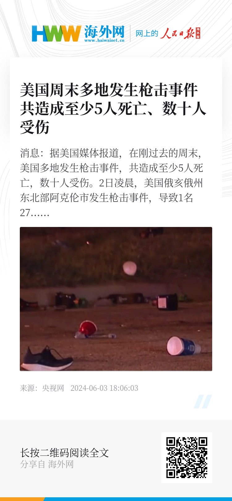 央视网消息:据美国媒体报道,在刚过去的周末,美国多地发生枪击事件,共造成至少5人死亡,数十人受伤。