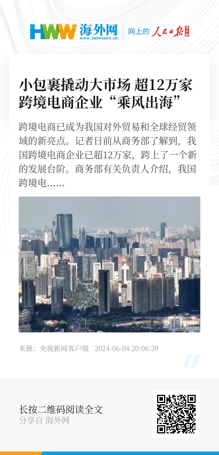 跨境电商已成为我国对外贸易和全球经贸领域的新亮点。记者日前从商务部了解到,我国跨境电商企业已超12万家,跨上了一个新的发展台阶。