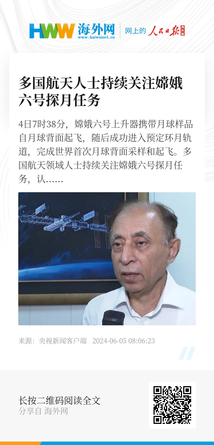 巴基斯坦空间技术研究所教授 立方星项目负责人 胡拉姆·胡尔希德:嫦娥六号进行月球背面采样是伟大的成就,是世界上的首次。月球背面的样品非常重要,有助于更深入地了解月球的形成历史,从科学角度来看,这次的任务非常具有挑战性。祝贺中国国家航天局,祝贺中国取得这样伟大的成就,我们非常高兴能够获得和中国合作的机会。