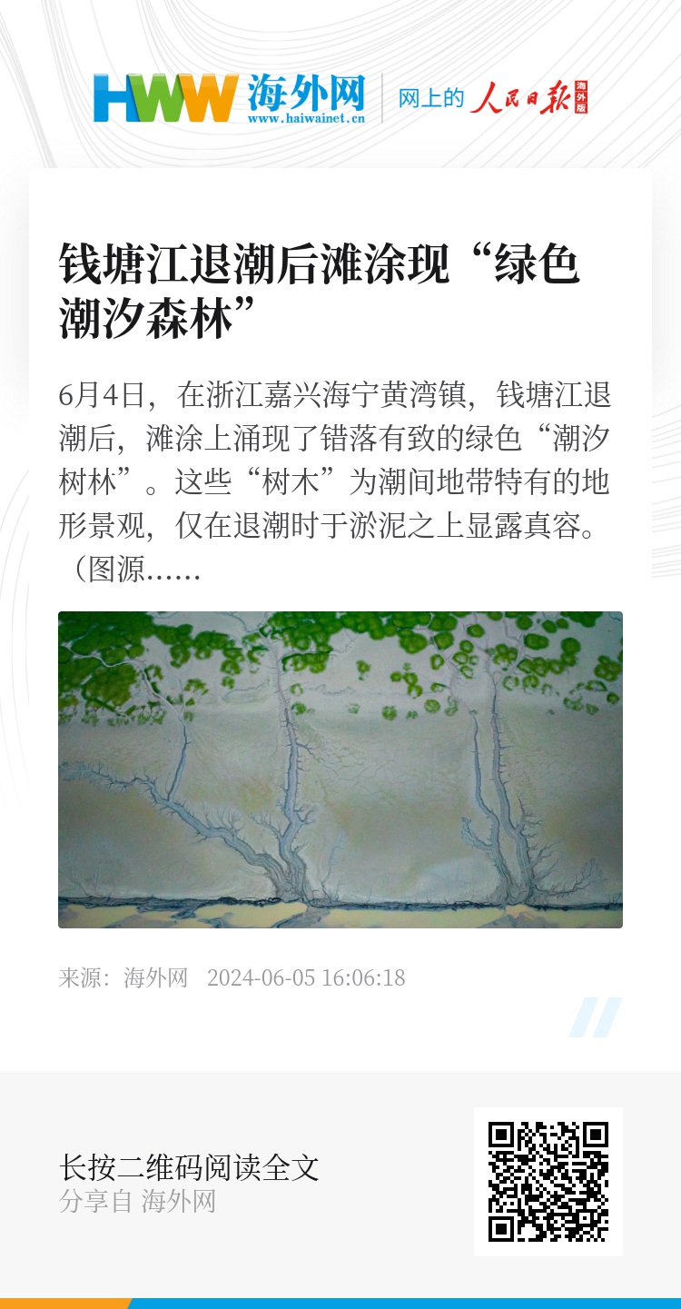 6月4日,在浙江嘉兴海宁黄湾镇,钱塘江退潮后,滩涂上涌现了错落有致的绿色“潮汐树林”。这些“树木”为潮间地带特有的地形景观,仅在退潮时于淤泥之上显露真容。(图源:视觉中国)