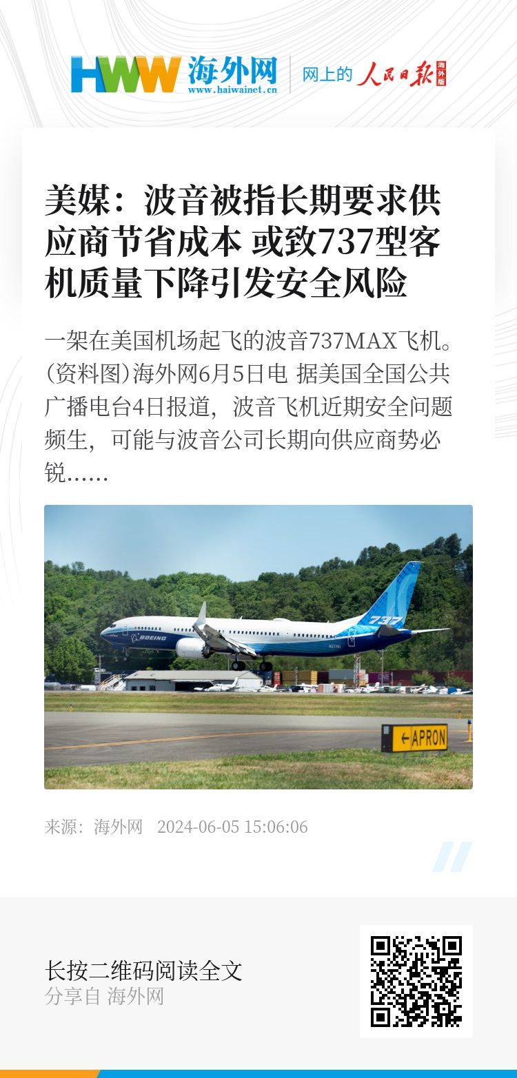 海外网6月5日电 据美国全国公共广播电台4日报道,波音飞机近期安全问题频生,可能与波音公司长期向供应商势必锐航空系统公司(Spirit AeroSystems)施压要求节省开支,导致工厂生产的飞机质量下降有关。