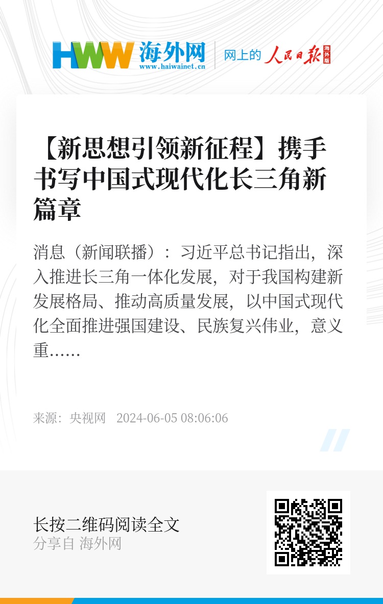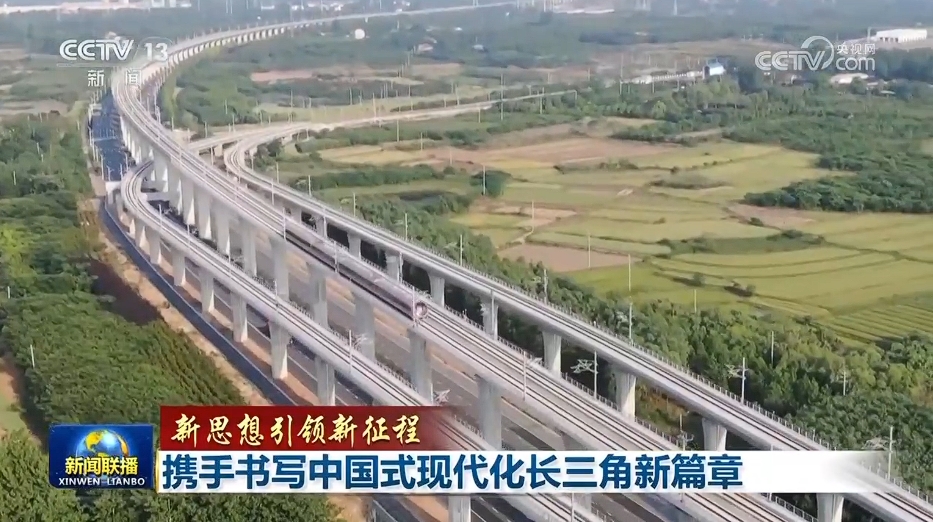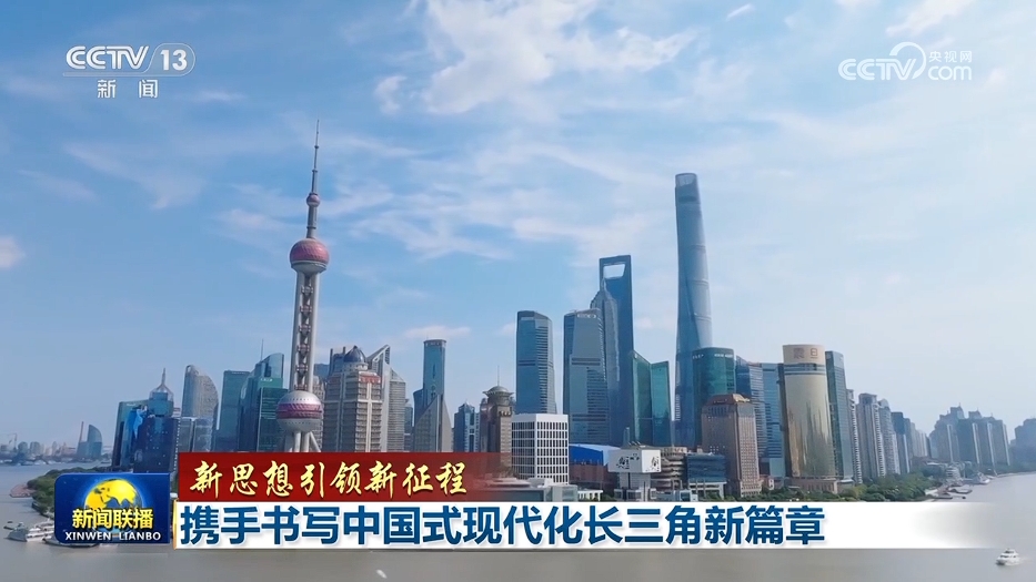 央视网消息(新闻联播):习近平总书记指出,深入推进长三角一体化发展,对于我国构建新发展格局、推动高质量发展,以中国式现代化全面推进强国建设、民族复兴伟业,意义重大。牢记总书记嘱托,沪苏浙皖三省一市紧扣一体化和高质量两个关键词,推动解决重大问题,推动重大改革落地,推动重点任务落实,携手书写中国式现代化长三角新篇章。
