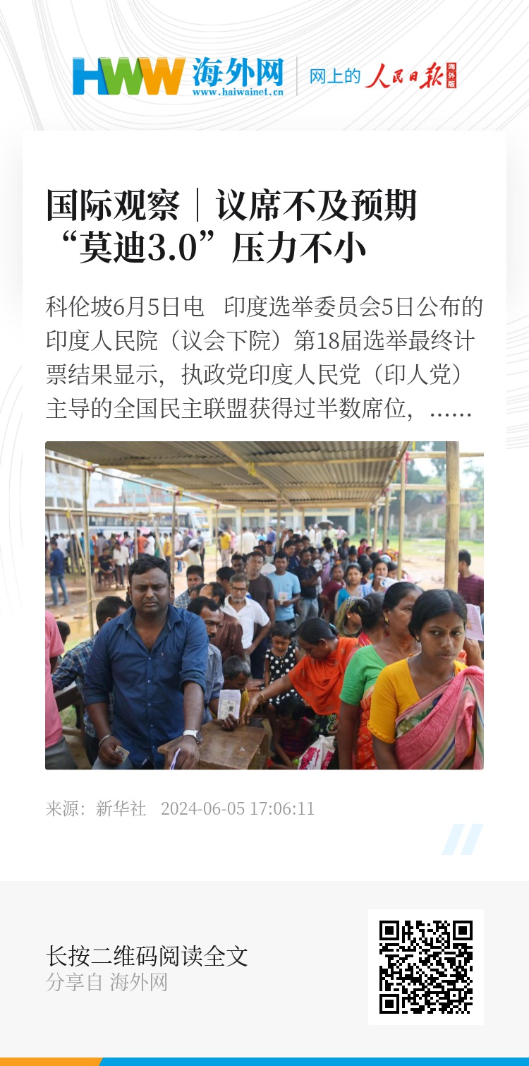 另外,莫迪在位于印度北方邦瓦拉纳西的选区胜选,当选印度人民院议员。舆论普遍认为他将开启第三个总理任期,追平印度首任总理尼赫鲁的任期纪录。据报道,莫迪已要求内阁制定连任后的“百日议程”。