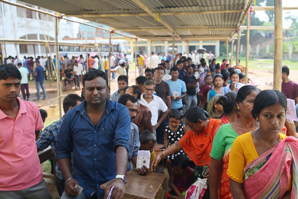 4月19日,在印度特里普拉邦阿加尔塔拉,人们在一处投票站参加印度人民院选举第一阶段投票。新华社发