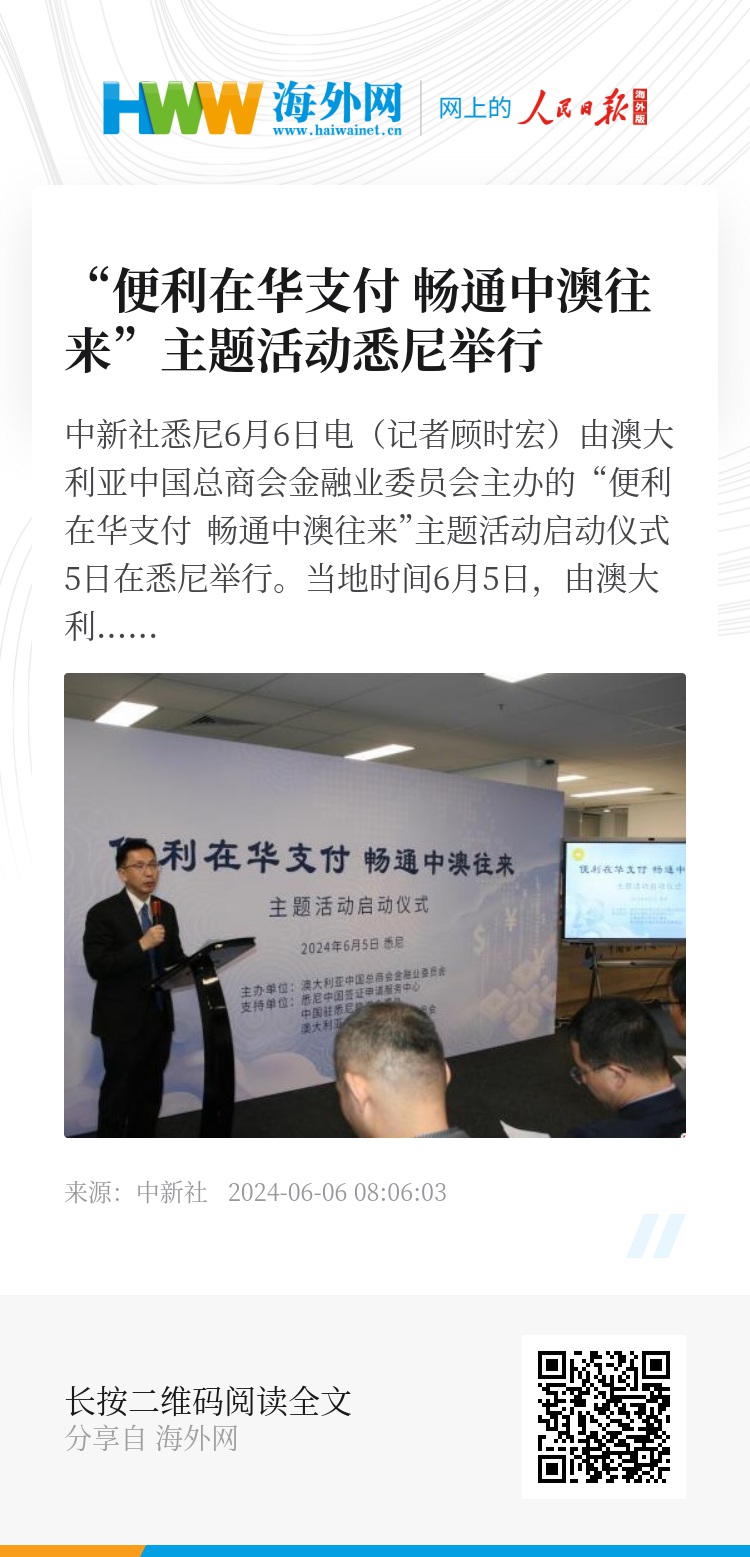 中新社悉尼6月6日电(记者顾时宏)由澳大利亚中国总商会金融业委员会主办的“便利在华支付 畅通中澳往来”主题活动启动仪式5日在悉尼举行。