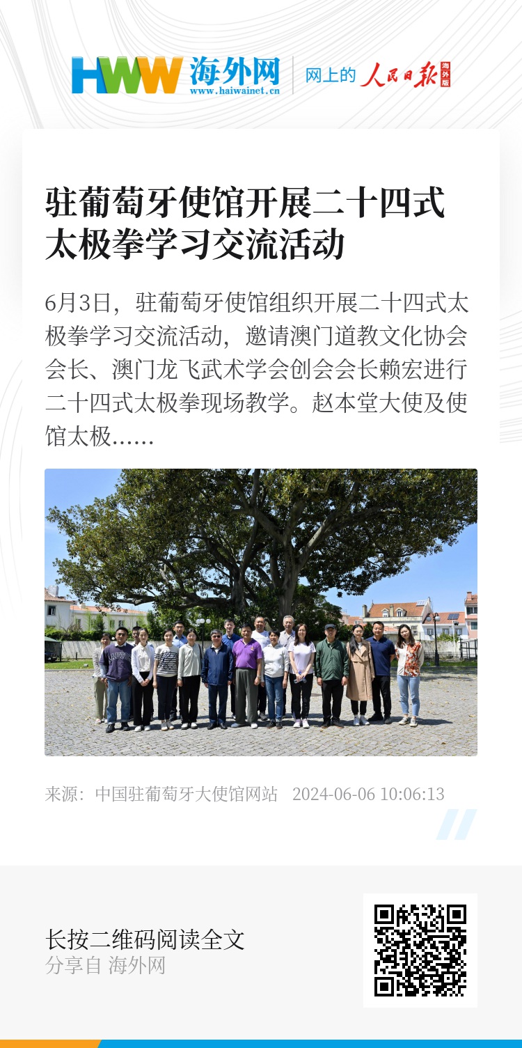 6月3日,驻葡萄牙使馆组织开展二十四式太极拳学习交流活动,邀请澳门道教文化协会会长、澳门龙飞武术学会创会会长赖宏进行二十四式太极拳现场教学。赵本堂大使及使馆太极拳兴趣小组约20人参加。