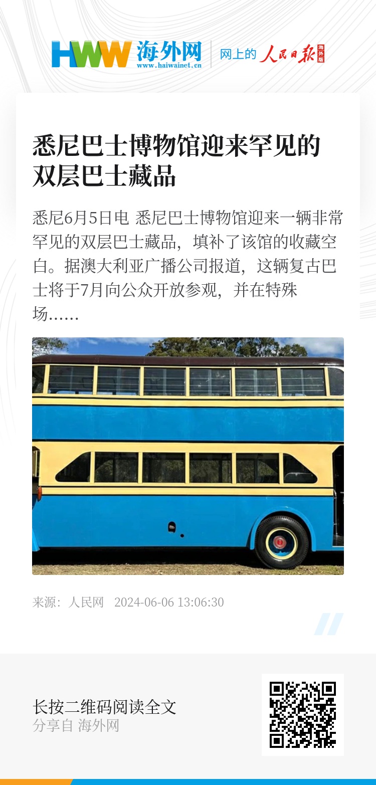人民网悉尼6月5日电 悉尼巴士博物馆迎来一辆非常罕见的双层巴士藏品,填补了该馆的收藏空白。据澳大利亚广播公司报道,这辆复古巴士将于7月向公众开放参观,并在特殊场合驾驶使用。