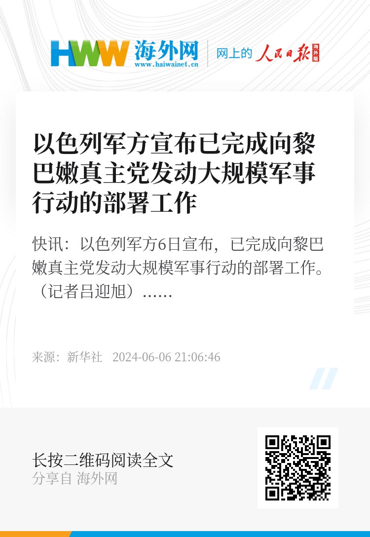 新华社快讯:以色列军方6日宣布,已完成向黎巴嫩真主党发动大规模军事行动的部署工作。(记者吕迎旭)