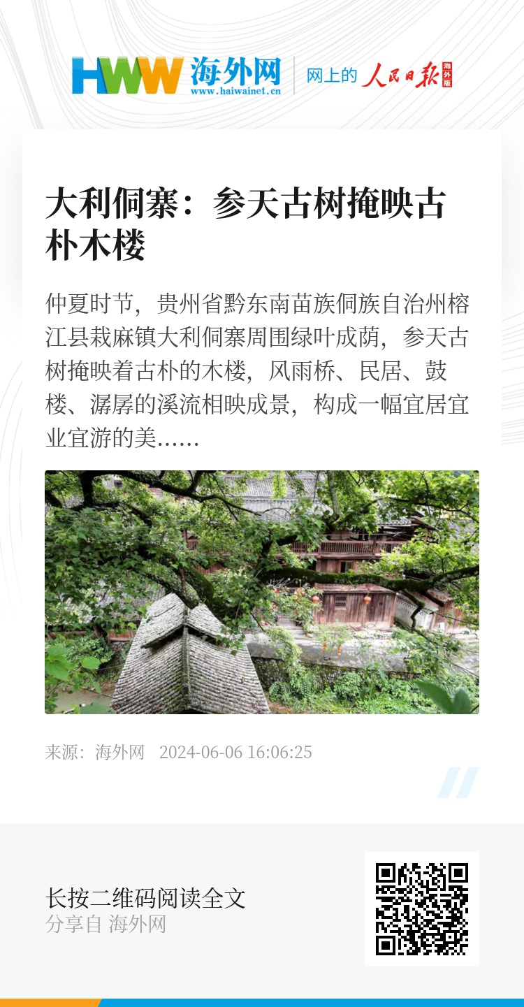 仲夏时节,贵州省黔东南苗族侗族自治州榕江县栽麻镇大利侗寨周围绿叶成荫,参天古树掩映着古朴的木楼,风雨桥、民居、鼓楼、潺孱的溪流相映成景,构成一幅宜居宜业宜游的美丽乡村画卷。图源:视觉中国