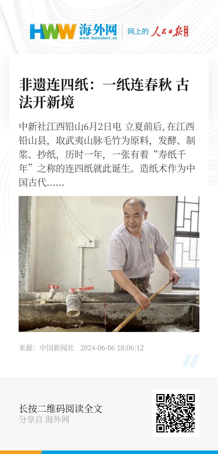 中新社江西铅山6月2日电 立夏前后,在江西铅山县,取武夷山脉毛竹为原料,发酵、制浆、抄纸,历时一年,一张有着“寿纸千年”之称的连四纸就此诞生。