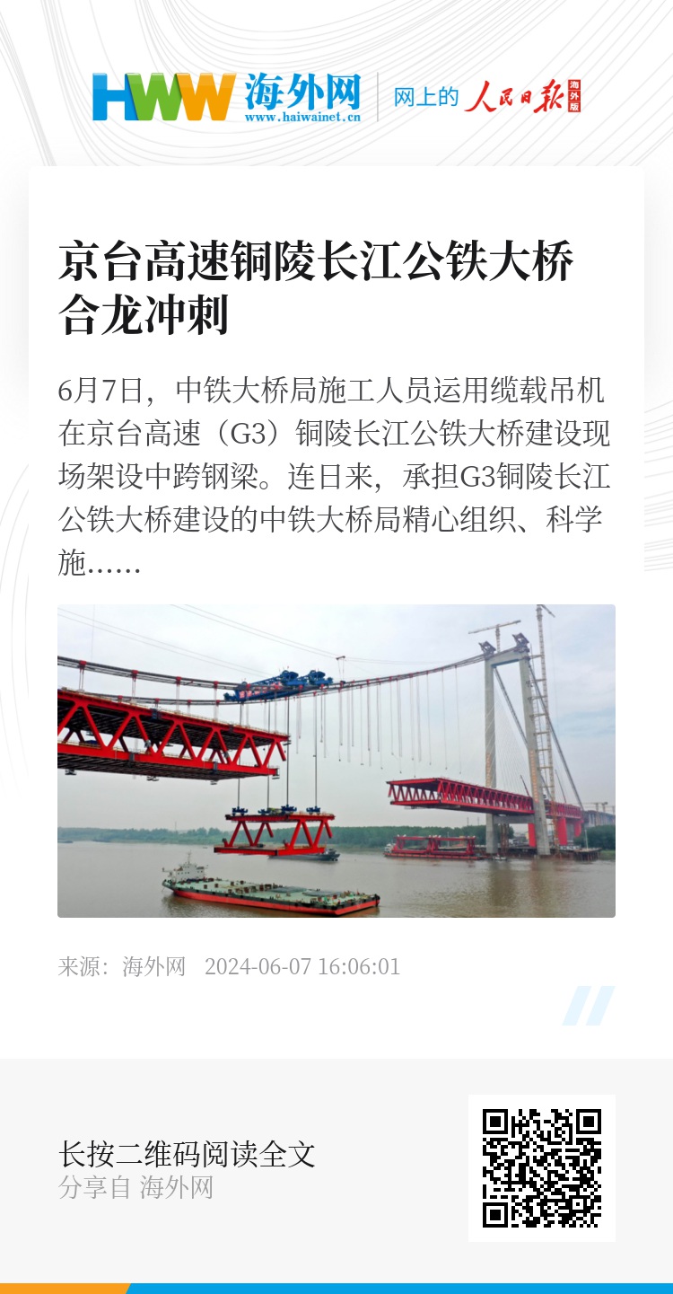 6月7日,中铁大桥局施工人员运用缆载吊机在京台高速(G3)铜陵长江公铁大桥建设现场架设中跨钢梁。连日来,承担G3铜陵长江公铁大桥建设的中铁大桥局精心组织、科学施工,稳步推进钢梁架设施工。目前,全桥59个节段钢梁架设已经超过大半,进入合龙前冲刺阶段。图源:视觉中国