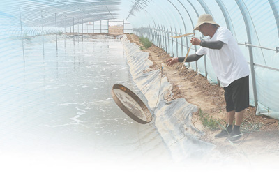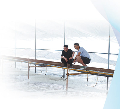 2016年,在当地政府帮助下,周晋成开始了“温棚标粗+外塘养成”接力式养殖南美白对虾的试验。在地势低洼的重度盐碱区,他挖虾塘、引虾苗,抽取地下盐碱水开展以渔治碱。