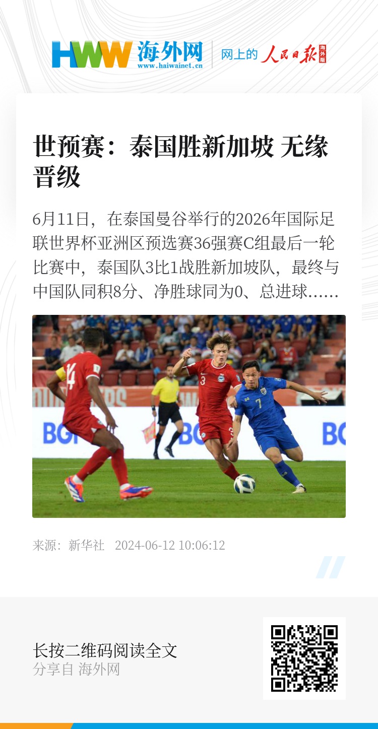 6月11日,在泰国曼谷举行的2026年国际足联世界杯亚洲区预选赛36强赛C组最后一轮比赛中,泰国队3比1战胜新加坡队,最终与中国队同积8分、净胜球同为0、总进球数同为9个,但由于1负1平的胜负关系劣势,无缘晋级下一轮。