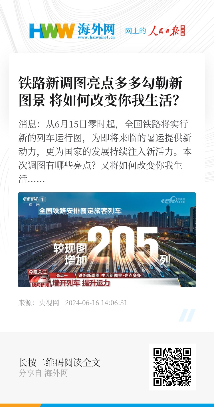 央视网消息:从6月15日零时起,全国铁路将实行新的列车运行图,为即将来临的暑运提供新动力,更为国家的发展持续注入新活力。本次调图有哪些亮点?又将如何改变你我生活呢?