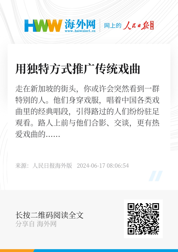 走在新加坡的街头,你或许会突然看到一群特别的人。他们身穿戏服,唱着中国各类戏曲里的经典唱段,引得路过的人们纷纷驻足观看。路人上前与他们合影、交谈,更有热爱戏曲的朋友选择加入他们的队伍。“戏曲出走”,就如它的名字一样,让戏曲活了起来。