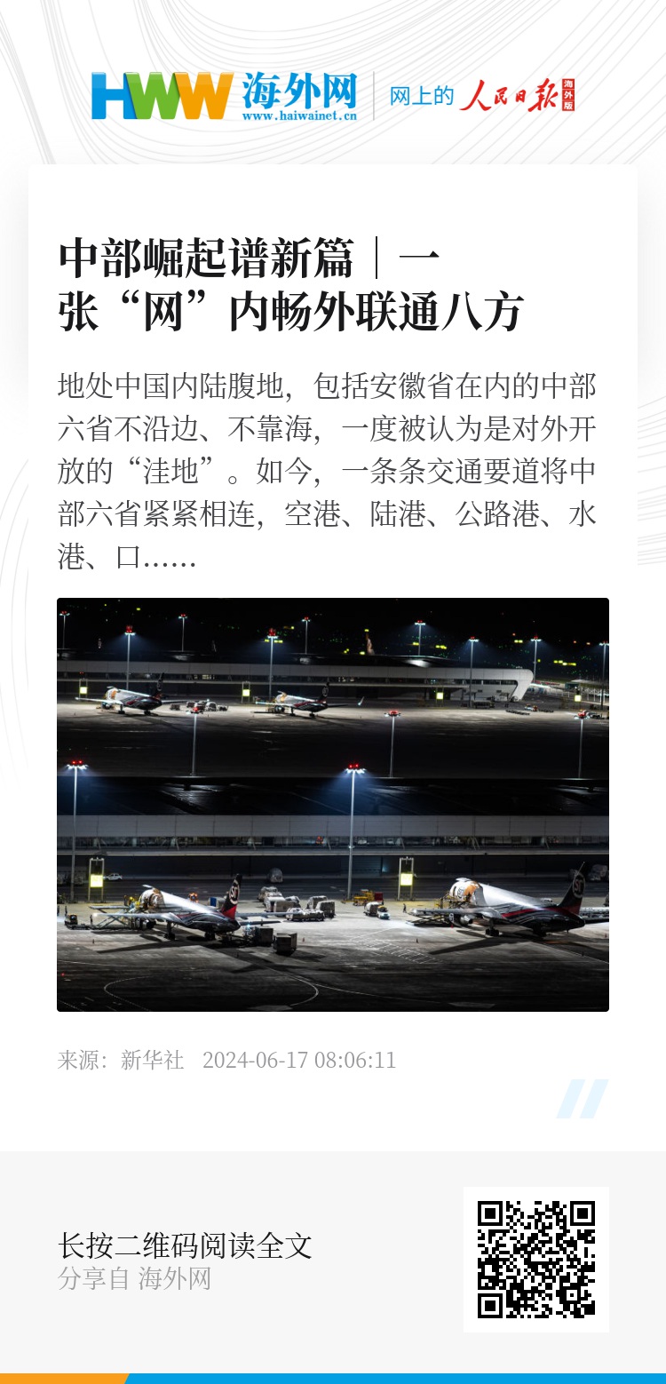 地处中国内陆腹地,包括安徽省在内的中部六省不沿边、不靠海,一度被认为是对外开放的“洼地”。如今,一条条交通要道将中部六省紧紧相连,空港、陆港、公路港、水港、口岸衔接融合的多式联运大格局加快形成。一张“交通网”,内畅外联通八方。