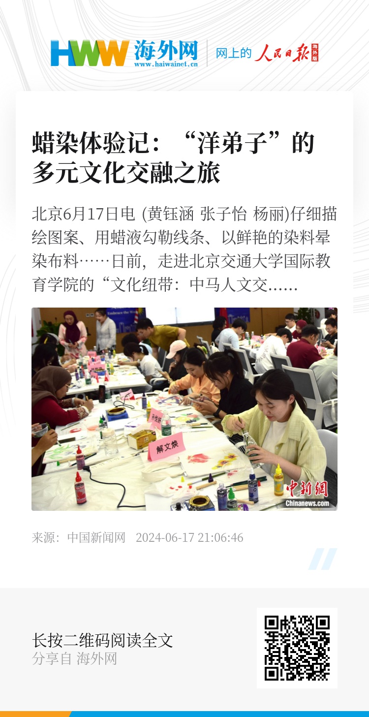 中新网北京6月17日电 (黄钰涵 张子怡 杨丽)仔细描绘图案、用蜡液勾勒线条、以鲜艳的染料晕染布料……日前,走进北京交通大学国际教育学院的“文化纽带:中马人文交流五十载”纪念活动,一场别开生面的马来西亚蜡染体验活动让来自马来西亚的“洋弟子”与中国同学共聚一堂,了解中马两国蜡染艺术异同,开启一场多元文化交融之旅。