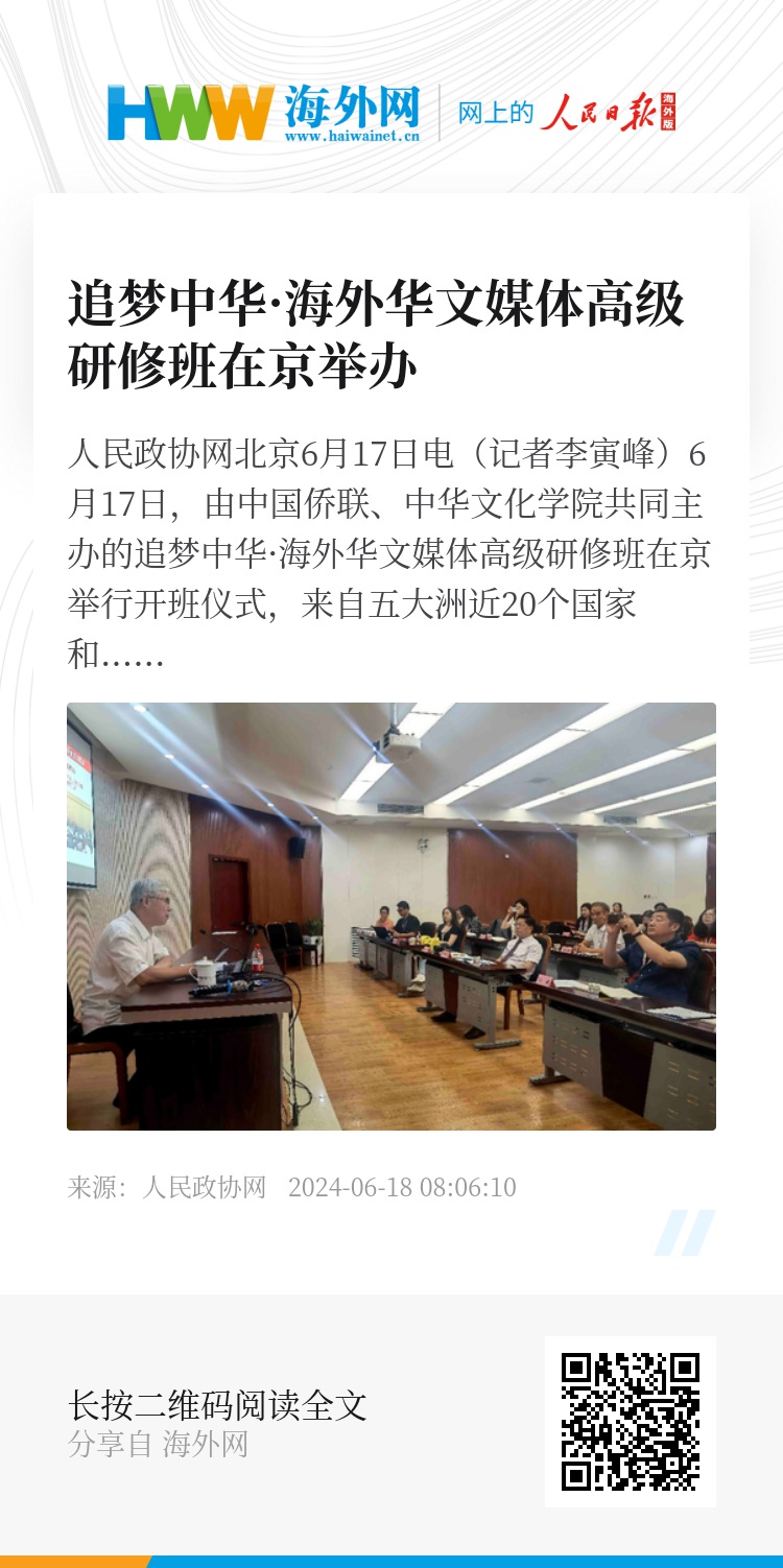 人民政协网北京6月17日电(记者李寅峰)6月17日,由中国侨联、中华文化学院共同主办的追梦中华·海外华文媒体高级研修班在京举行开班仪式,来自五大洲近20个国家和地区约30位华文媒体人抵京研修。