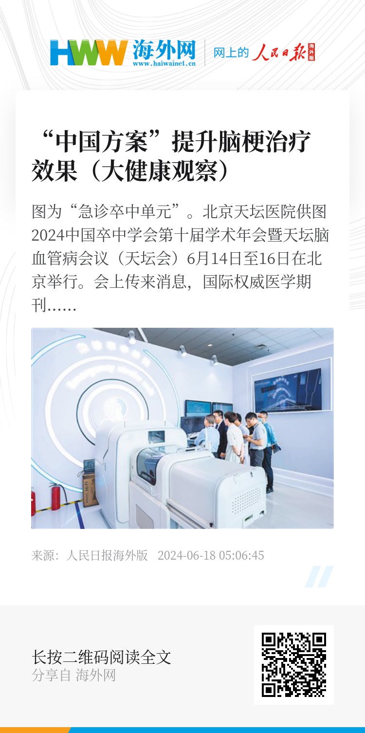 2024中国卒中学会第十届学术年会暨天坛脑血管病会议(天坛会)6月14日至16日在北京举行。会上传来消息,国际权威医学期刊《新英格兰医学杂志》(NEJM)6月15日同时发布来自首都医科大学附属北京天坛医院王拥军教授团队的国产溶栓药瑞替普酶、替奈普酶治疗缺血性卒中的两篇重磅文章。同时,由北京天坛医院独创的全自主知识产权的“急诊卒中单元”正式亮相。