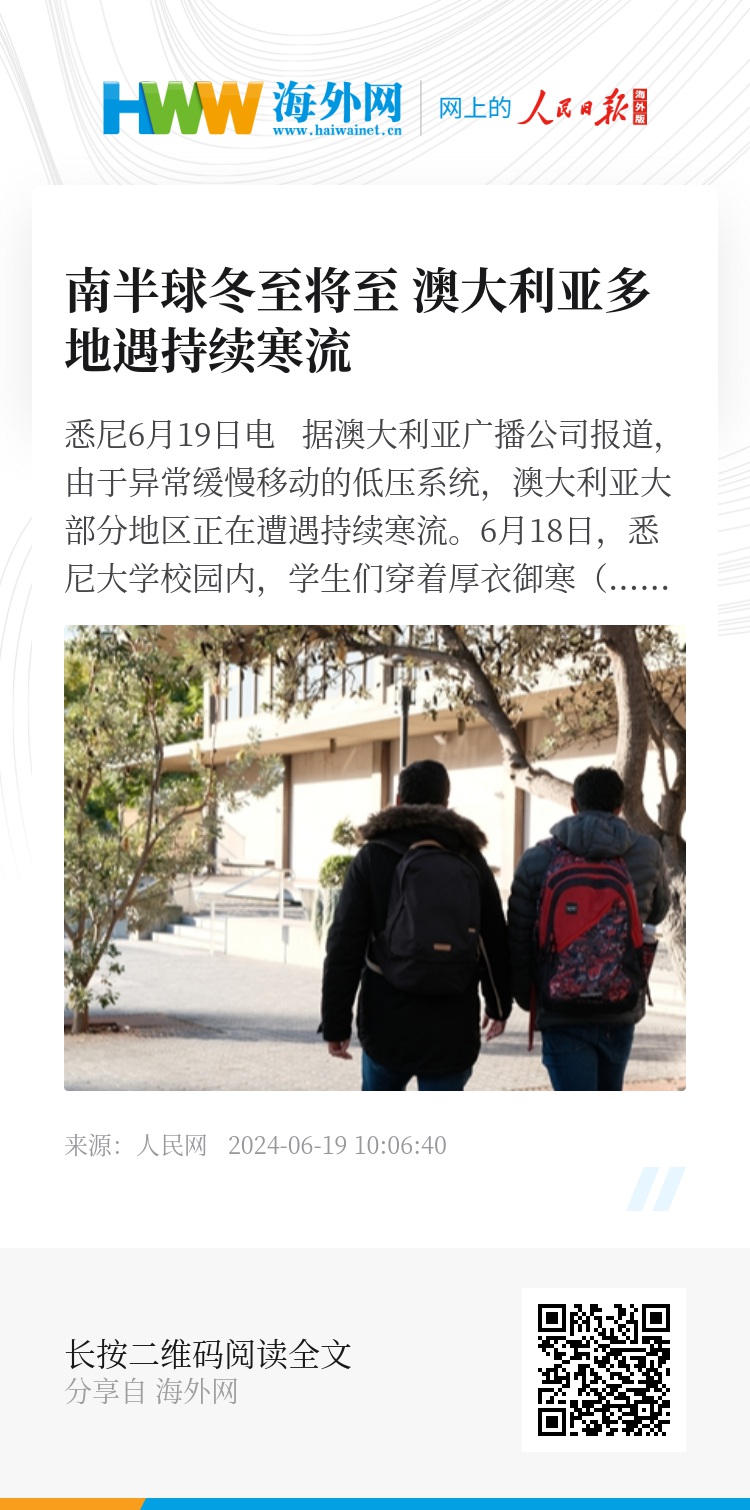 澳气象局表示,15日至17日,包括塔斯马尼亚州、昆士兰州在内的六个州和领地早晨气温降至零度以下。白天气温也很难回升,维多利亚州和南澳大利亚州部分地区在15日至16日经历了20多年以来最寒冷的六月天。18和19日更加寒冷,塔斯马尼亚州、维多利亚州、新南威尔士州和首都领地或将出现大面积晨霜。