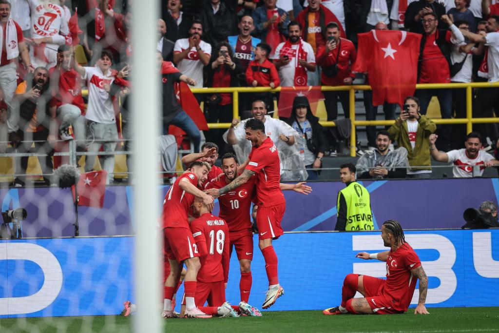 6月18日,土耳其队球员梅尔特·穆尔杜尔(18号)进球后与队友庆祝。新华社记者 潘昱龙 摄