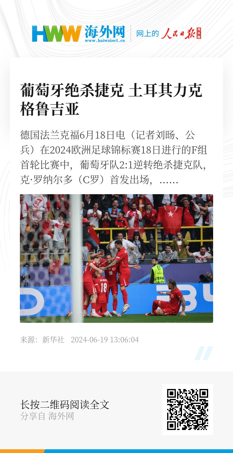 新华社德国法兰克福6月18日电(记者刘旸、公兵)在2024欧洲足球锦标赛18日进行的F组首轮比赛中,葡萄牙队2:1逆转绝杀捷克队,克·罗纳尔多(C罗)首发出场,职业生涯第六次征战欧锦赛;土耳其队3:1力克首次参加欧锦赛正赛的格鲁吉亚队。