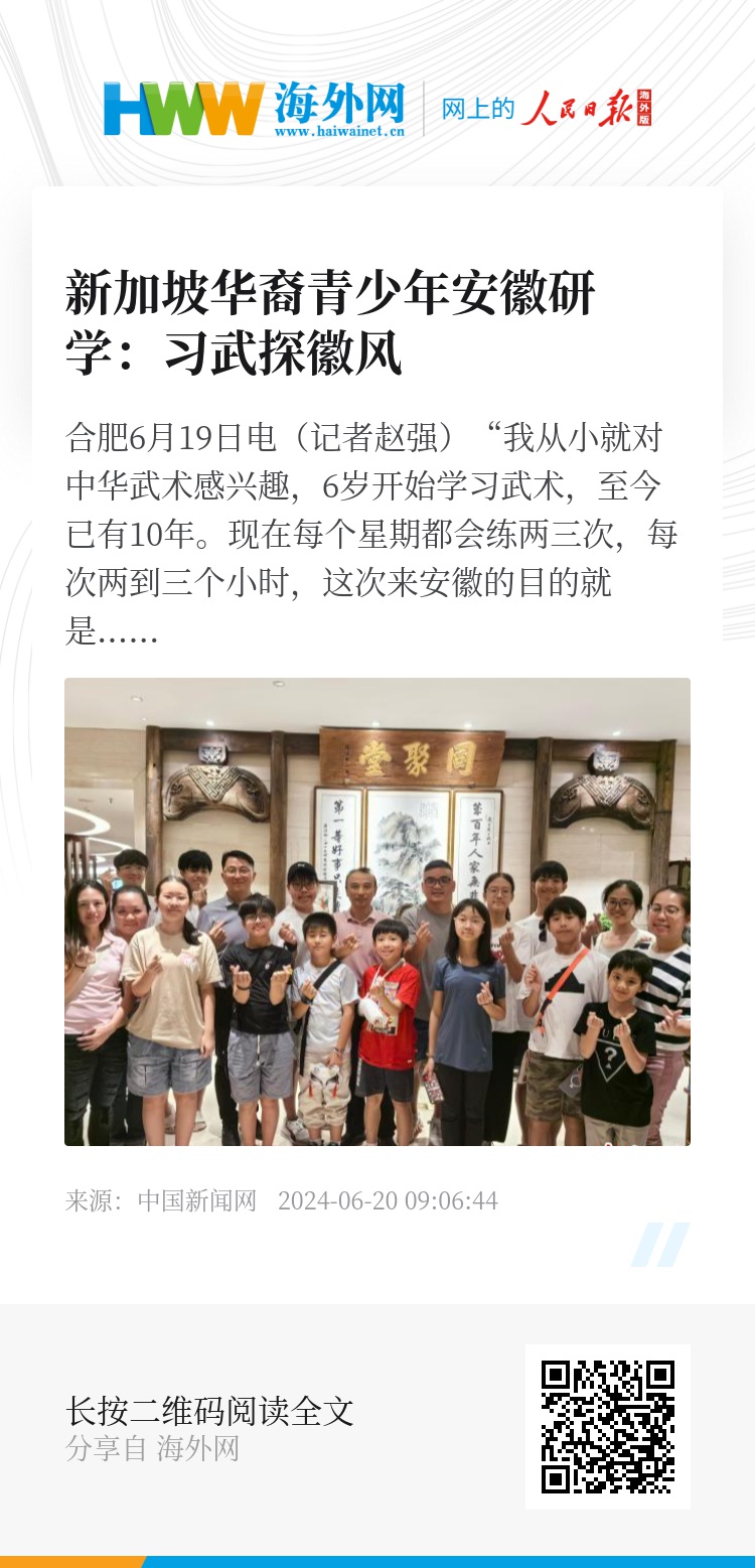 据新加坡青少年文化艺术中心创始人胡刚介绍,作为第六届“一带一路”新加坡国际文化节系列活动之一,此次研学之旅,让孩子们真切感受到现代化美好安徽的风景之美、发展之快。在为期10天的研学活动中,新加坡华裔青少年与安徽的青少年、运动员共同研习武术,沉浸式体验徽风皖韵,亲身感受中华传统文化的博大精深和源远流长的徽州文化。