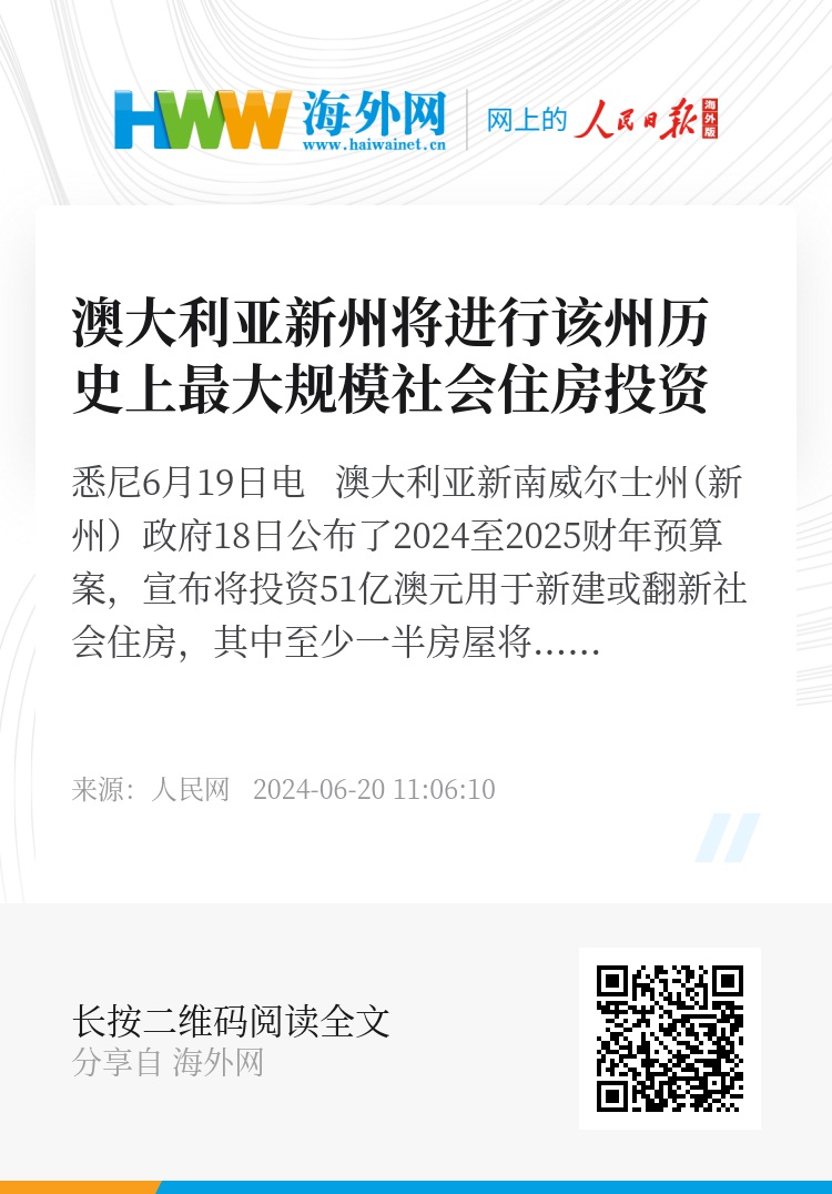 人民网悉尼6月19日电 澳大利亚新南威尔士州(新州)政府18日公布了2024至2025财年预算案,宣布将投资51亿澳元用于新建或翻新社会住房,其中至少一半房屋将优先用于安置摆脱家庭暴力的妇女和儿童。