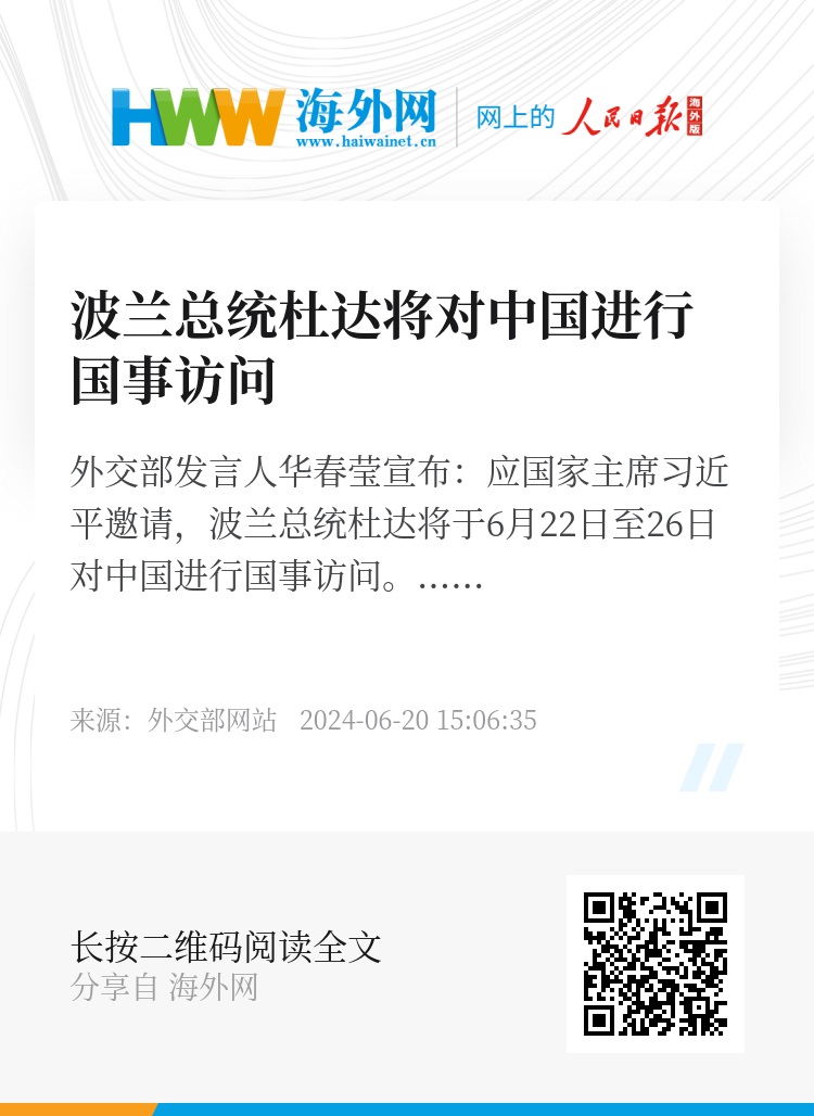 应国家主席习近平邀请,波兰总统杜达将于6月22日至26日对中国进行国事访问。