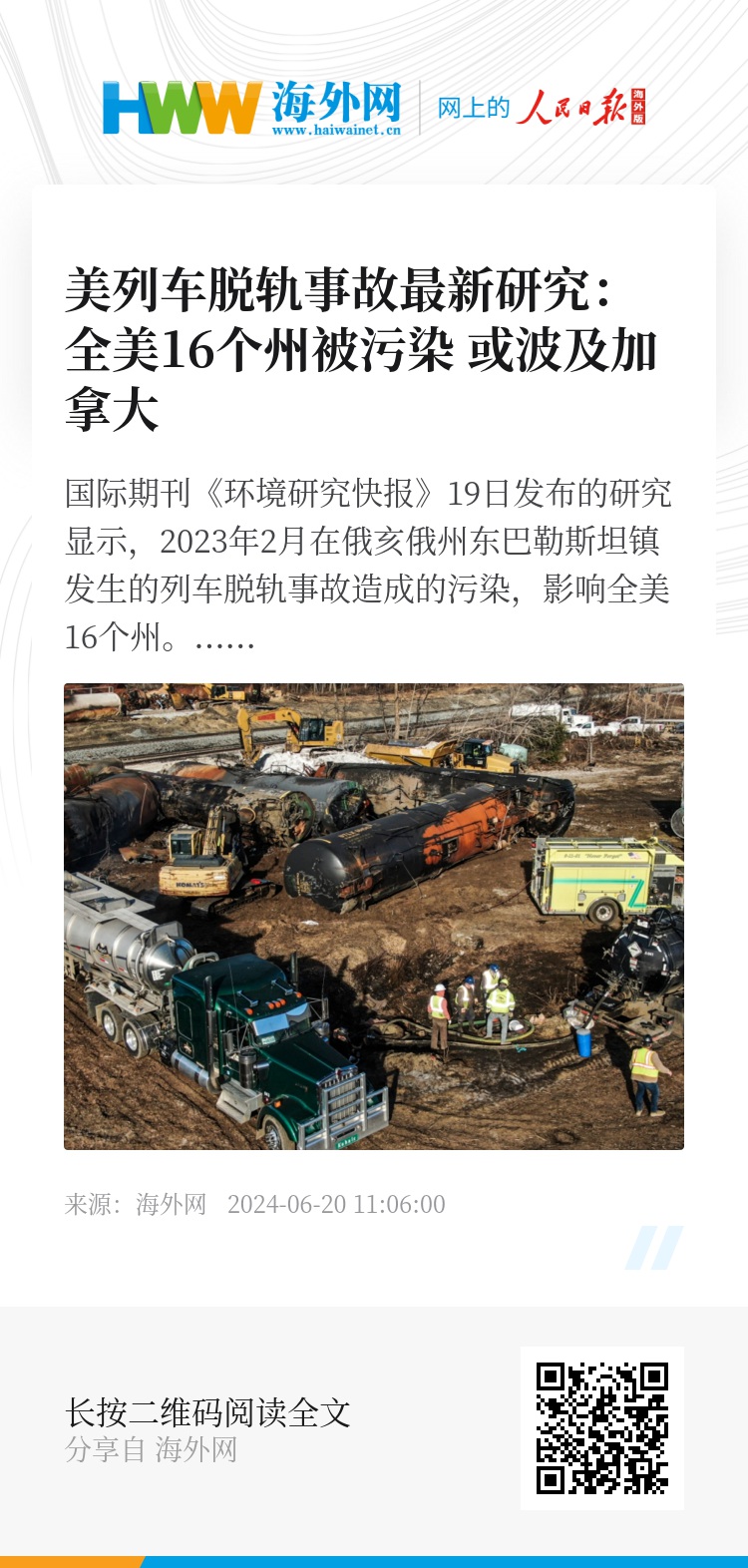 海外网6月20日电 据美国广播公司报道,国际期刊《环境研究快报》19日发布的研究显示,2023年2月在俄亥俄州东巴勒斯坦镇发生的列车脱轨事故造成的破坏,远远超出最初的地点,污染影响全美16个州。