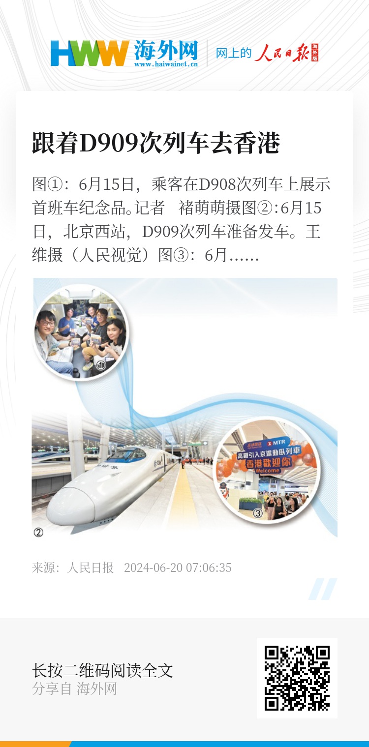 6月15日20时13分,一声铃响,D909次列车载着数百名旅客准时从北京西站缓缓驶出,驶向目的地香港西九龙站。