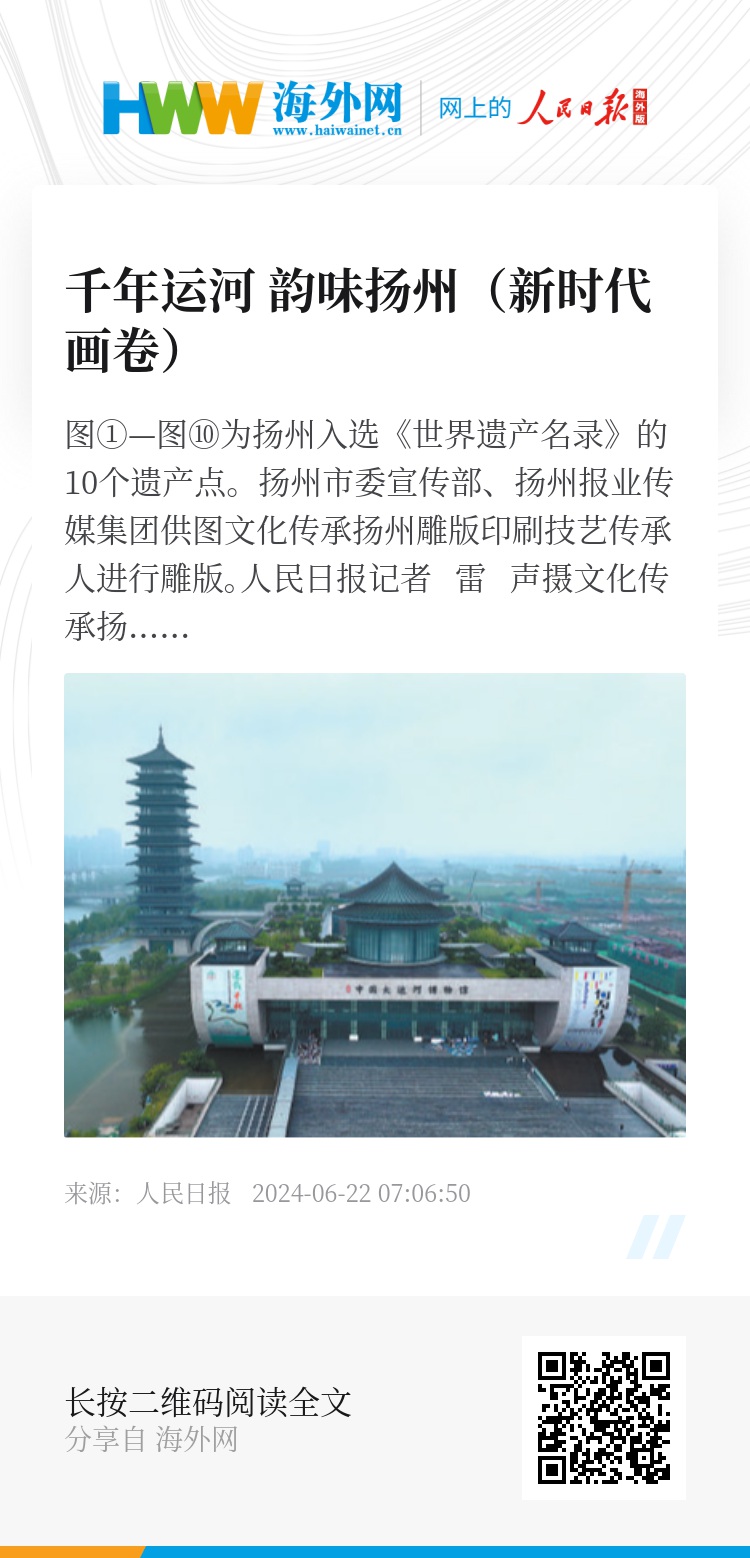 桨声灯影里,特色民俗展示引得游人驻足;健身步道上,居民休闲健身新空间不断拓展;水光潋滟间,人与自然和谐共生的生态画卷徐徐铺展……2014年6月,中国大运河成功入选《世界遗产名录》,其中,江苏扬州共有10个遗产点、6段河道被列入。近年来,扬州持续加强大运河文化传承保护,不断推进沿岸生态改善提升,让古老运河焕发出新的时代风貌。