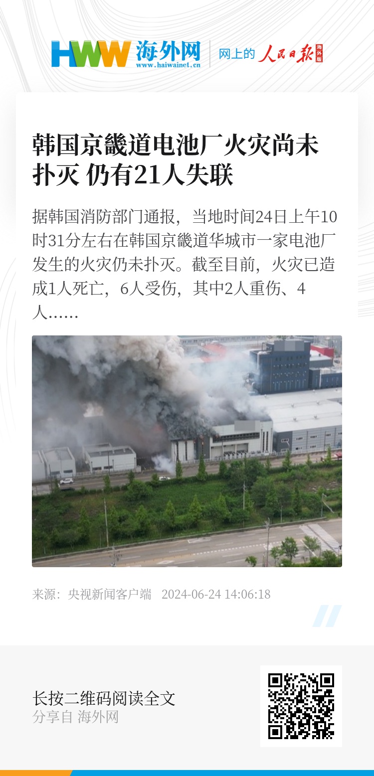 据韩国消防部门通报,当地时间24日上午10时31分左右在韩国京畿道华城市一家电池厂发生的火灾仍未扑灭。截至目前,火灾已造成1人死亡,6人受伤,其中2人重伤、4人轻伤,工厂内还有21人失联。