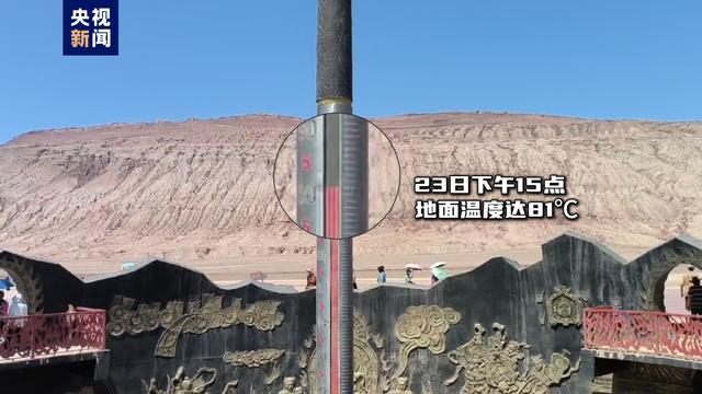6月23日15点左右,新疆吐鲁番市火焰山景区内巨型“金箍棒”温度计显示这一区域地表温度达到81℃。尽管天气炎热,但仍有来自全国各地的游客“逐热而来”。