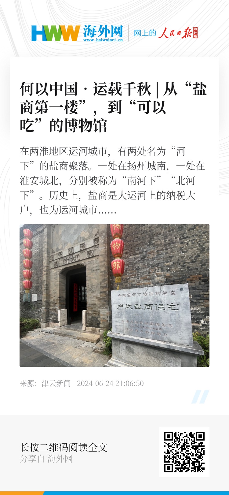 中国大运河申遗成功,盐商们留下的遗迹则是大运河沿线不可或缺的遗产点。有“盐商第一楼”之称的卢氏盐商住宅,历经百年风雨的卢宅,承载着深厚的盐运文化,也成为中外游客品味淮扬菜的好去处。