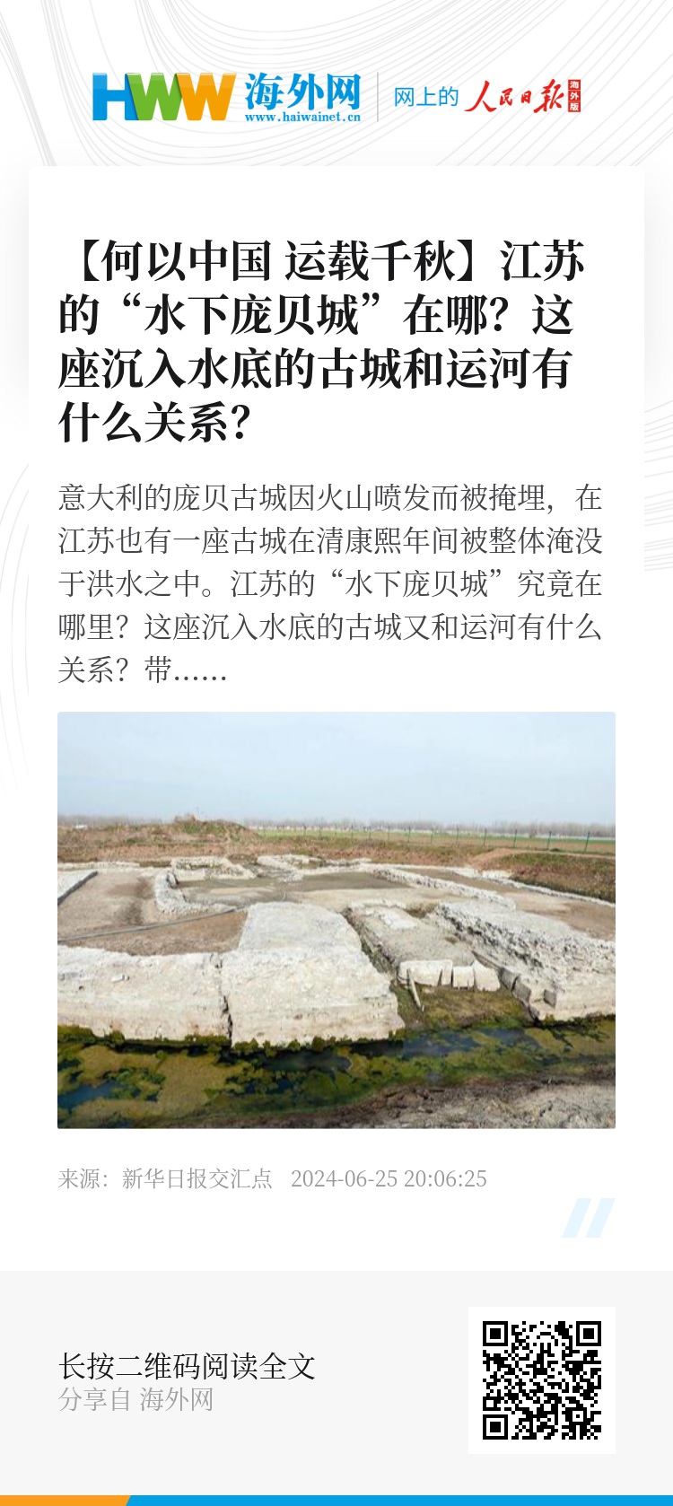 意大利的庞贝古城因火山喷发而被掩埋,在江苏也有一座古城在清康熙年间被整体淹没于洪水之中。江苏的“水下庞贝城”究竟在哪里?这座沉入水底的古城又和运河有什么关系?带着疑问,记者走近中国大运河沿线唯一一座消失并定格在历史长河中的州城。