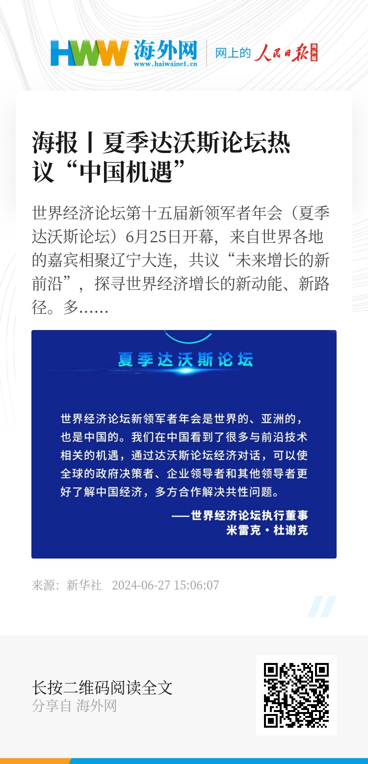 多国与会人士表示,中国经济韧性强、市场大、投资机会广,有能力助推全球经济增长,期待通过夏季达沃斯论坛更好了解中国经济,加强交流对话,探寻多方合作机遇,助力世界经济复苏。