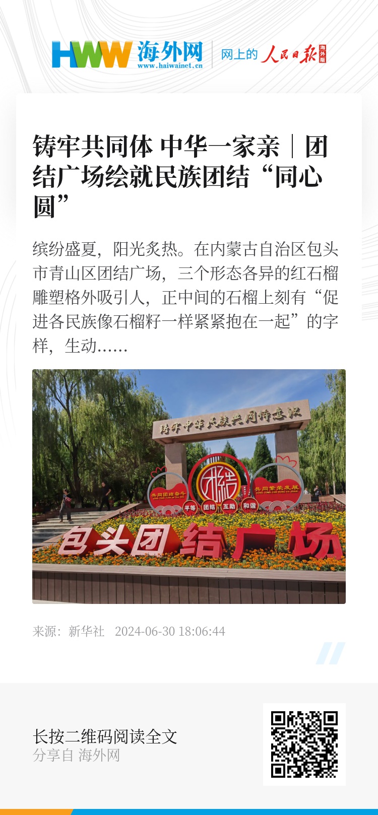缤纷盛夏,阳光炙热。在内蒙古自治区包头市青山区团结广场,三个形态各异的红石榴雕塑格外吸引人,正中间的石榴上刻有“促进各民族像石榴籽一样紧紧抱在一起”的字样,生动讲述着包头市各民族心手相牵、亲如一家的民族团结佳话。