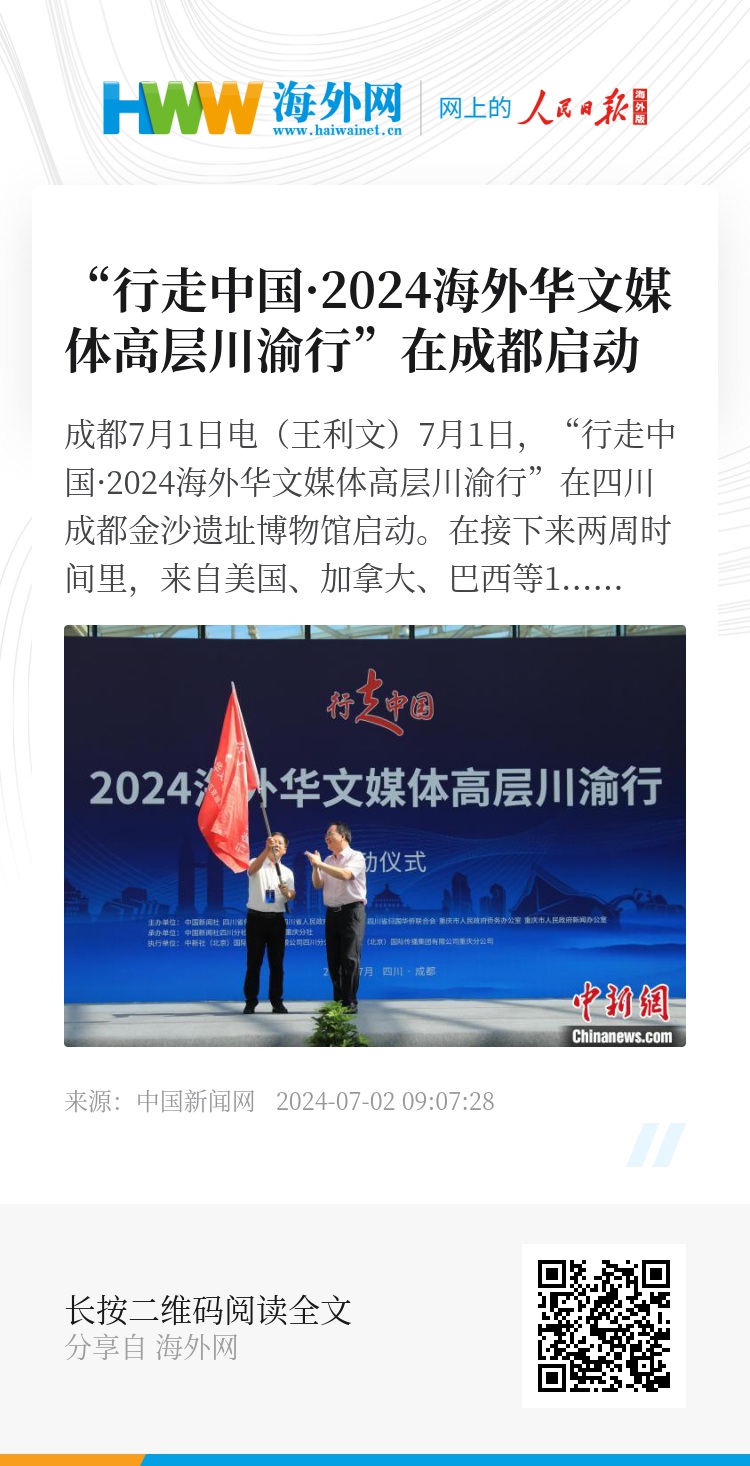 中新网成都7月1日电(王利文)7月1日,“行走中国·2024海外华文媒体高层川渝行”在四川成都金沙遗址博物馆启动。在接下来两周时间里,来自美国、加拿大、巴西等19个国家的24家主流华文媒体将赴川渝参访,探寻成渝地区双城经济圈的发展机遇与潜力,向世界展现巴蜀现代化建设发展新面貌。