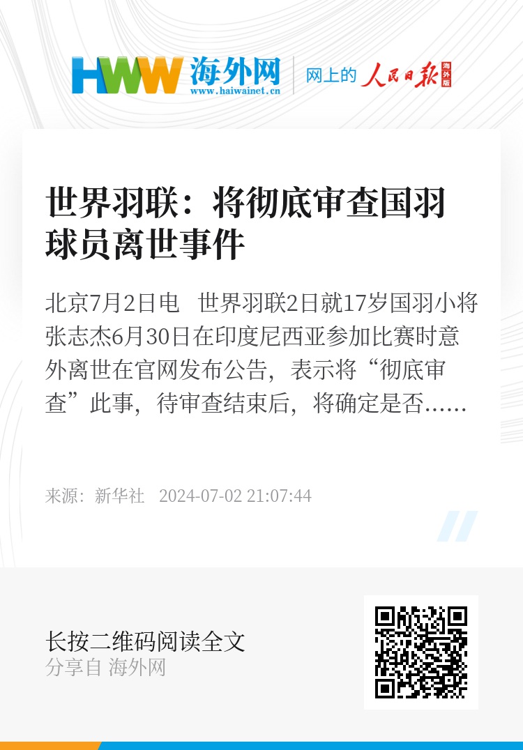 新华社北京7月2日电 世界羽联2日就17岁国羽小将张志杰6月30日在印度尼西亚参加比赛时意外离世在官网发布公告,表示将“彻底审查”此事,待审查结束后,将确定是否需要修改医疗准则的具体内容。