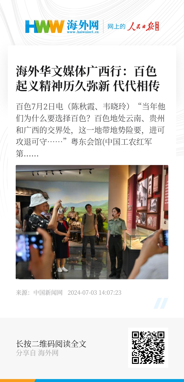 7月1日,2024年“海外华文媒体广西行”采访团走进革命老区百色,参观粤东会馆、百色起义纪念馆、百色脱贫攻坚展示馆等场所,了解百色历史,追忆峥嵘岁月,感受红城沧桑巨变。