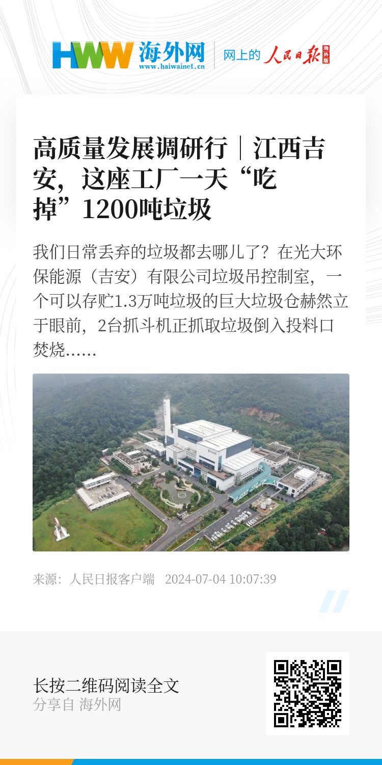 目前,光大环保能源(吉安)有限公司拥有2台600吨/日机械炉排焚烧炉和1台25兆瓦汽轮发电机组,每天可焚烧生活垃圾1200吨,所发电能服务人口超200万。截至2024年6月,已累计处理生活垃圾188.4万吨,提供绿色电力7.44亿千瓦时,减排二氧化碳75.36万吨,“令人头痛的生活垃圾、餐厨垃圾及秸秆等固体废物,已成为我们发电企业的‘香饽饽’,吃干榨尽、变废为宝,转换为绿色能源。”许鹏说。(人民日报客户端江西频道 周欢 陈振凯 何欣禹)