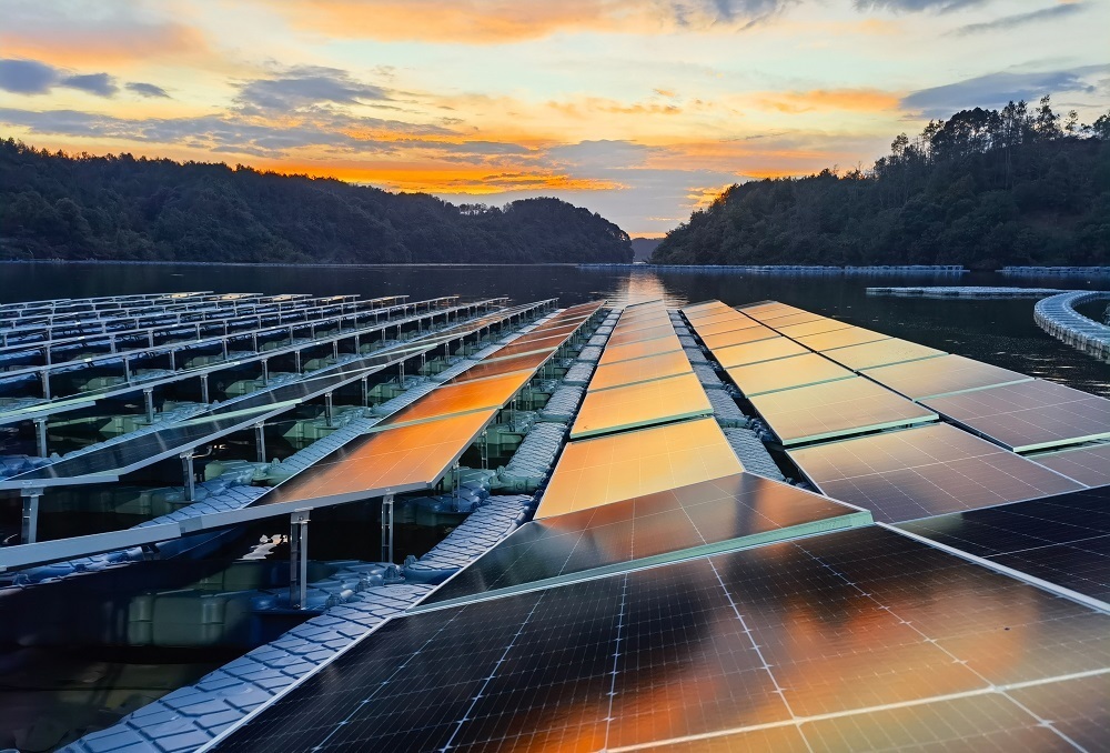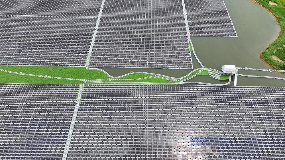 在江西省万安县韶口乡韶口村一座水库,开阔的水面上,一排排太阳能光伏板连成一片,水下,条条鱼儿竞自由。