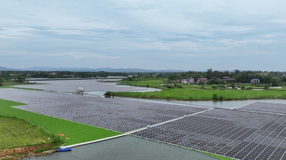 这是韶口乡“水上发电、水下养鱼”项目——将光伏发电与传统渔业养殖有机融合,在两座水库闲置水面及周边抬田区域共1800多亩水域上,建成54兆瓦“漂浮式”渔光互补光伏发电区。