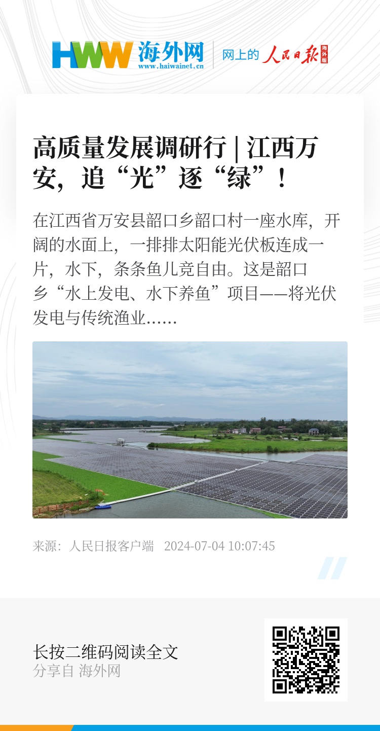 “项目计划运行25年,全周期总发电量将达到26亿多千瓦时,纳税总额1.05亿元,总计土地流转费用1612万元,将有力地促进当地发展。”万安县韶口光伏电站负责人李方海说。(人民日报客户端江西频道 周欢 陈振凯 何欣禹)
