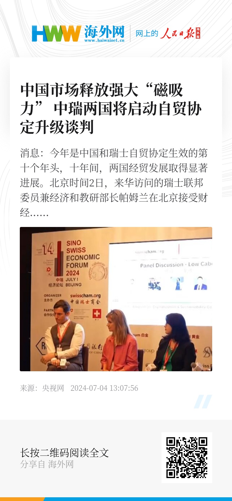 瑞士联邦委员兼经济和教研部长帕姆兰称:“我是一个乐观主义者,我们应该保持面向未来的积极态度,全球发展面临着多项重大挑战,我本次访华与中方官员就中瑞在数字化、应对气候变化、医疗健康和健康技术等领域的合作展开交流。在这些领域,瑞士和中国高度互补。”
