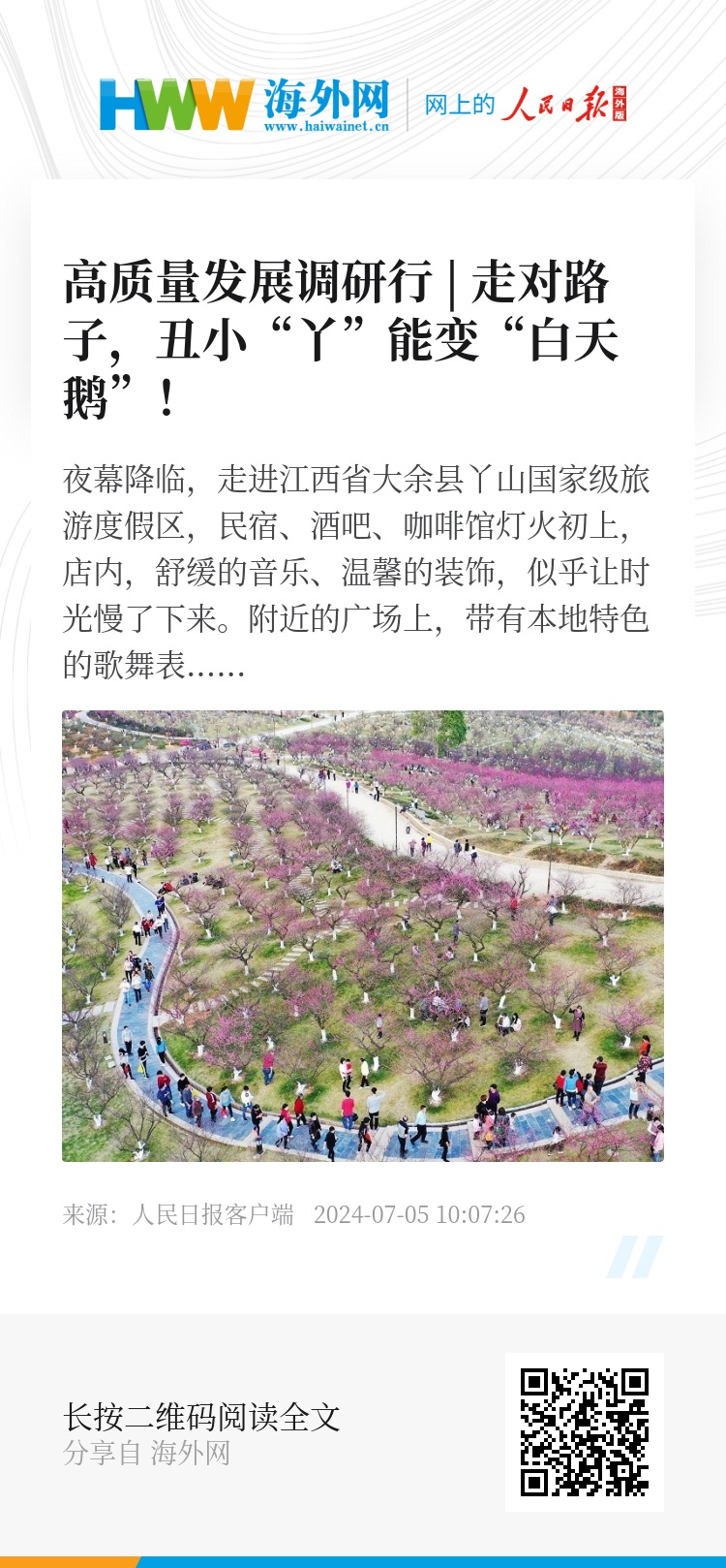 村民变员工,员工变股东,股东变老板。“村民依靠在景区务工、房地流转、资源入股,实现了多渠道增收。”曹祖洪说,生态旅游直接带动2000余名农户、间接带动周边7个乡镇近万名农户致富。2023年,大龙村村集体经济收入达102.5万元,村民人均收入达3万元。(文/人民日报客户端江西频道周欢 陈振凯 何欣禹 图/大余县委宣传部)